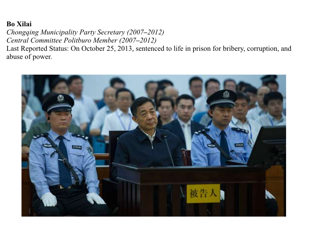 On September 22, 2013, Bo was sentenced to life in prison for bribery, embezzlement and abuse of power. In contrast to the staged court proceedings of previous fallen officials, Bo denied all three charges and filed for an appeal. Due to the CCP’s control over China’s judicial system, Bo’s appeal was rejected and the high court in Shandong finalized his life sentence one month later.