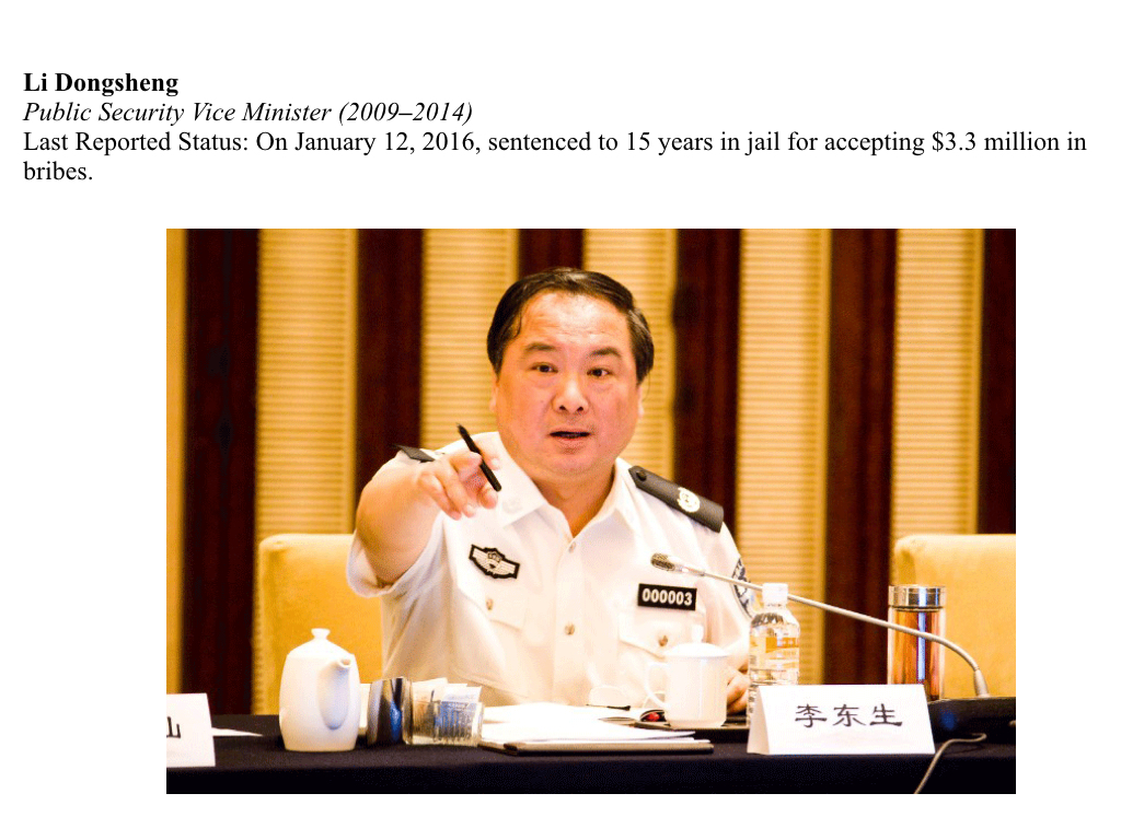 On August 21, 2015, Li Dongsheng was charged with corruption. According to the Supreme People’s Procuratorate, Li abused his official power by accepting bribes in return for granting special favors throughout his tenure at the state-run China Central Television (CCTV), Ministry of Public Security, and the CCP’s Central Politics and Law Commission. Zhou Yongkang led two of these three organizations.