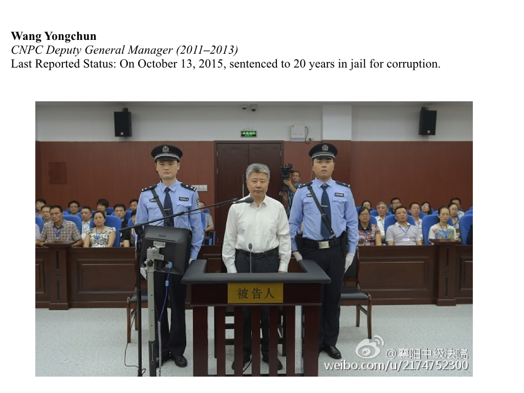 A 2009 Brookings Institution report states, “According to one oil industry insider, a ‘rule of thumb’ is that anyone above the director level at CNPC who worked at Shengli was promoted by Zhou […].” Since then, multiple executives of CNPC, where Zhou worked for 32 years, have been placed under investigation. These include CNPC Vice President Wang Yongchun, Petrochina (CNPC subsidiary) Vice President Ran Xinquan, and Petrochina Chief Geologist Wang Daofu. In a sign of Zhou Yongkang’s influence even within other state-owned oil conglomerates, Sinopec Group President Wang Tianpu was expelled from the party in September 2015 due to allegations of corruption, including favoring Zhou’s son in oil equipment sales.