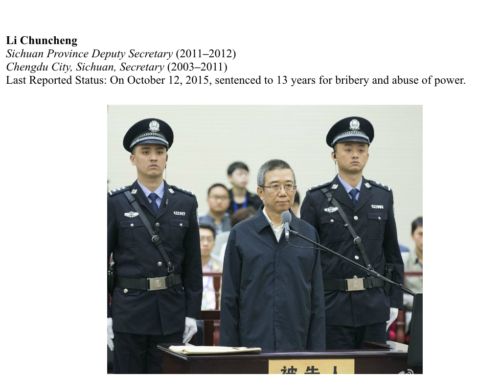 While working in government, Li Chuncheng worked closely with Guo Yongxiang and Li Chongxi (unrelated). Both associates were sentenced to jail for corruption. In fact, Li Chongxi was a leading force within a political faction in Sichuan’s Ziyang city. Loosely grouped as the Ziyang faction, six officials have been arrested or sentenced for corruption. (1)