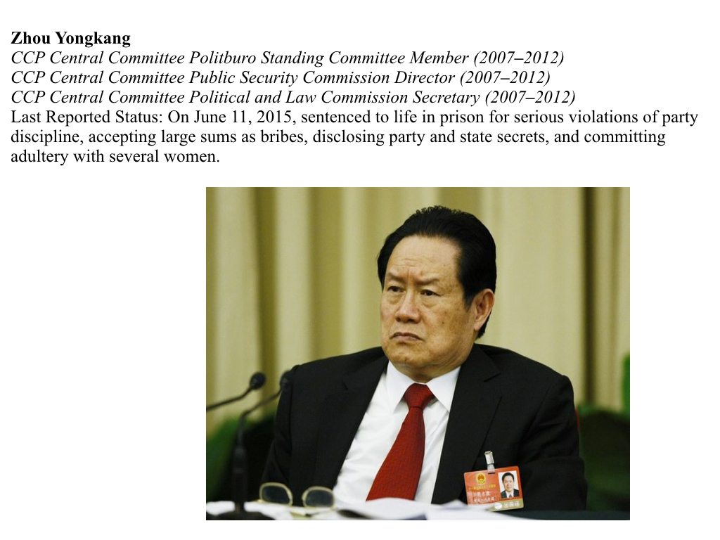 On April 3, 2015, at age 73, Zhou was sentenced to life in prison for corruption, abuse of power, and leaking state secrets. The official Xinhua statement described how Zhou abused his power as a state and party official to enrich family members, associates, and himself, “resulting in serious losses of state-owned assets.” Court records have documented that Zhou directly accepted $118,000 in bribes. The real beneficiaries were his wife and son, whose assets totaled $300 million, $20 million of which prosecutors confirmed were accepted with Zhou’s knowledge.