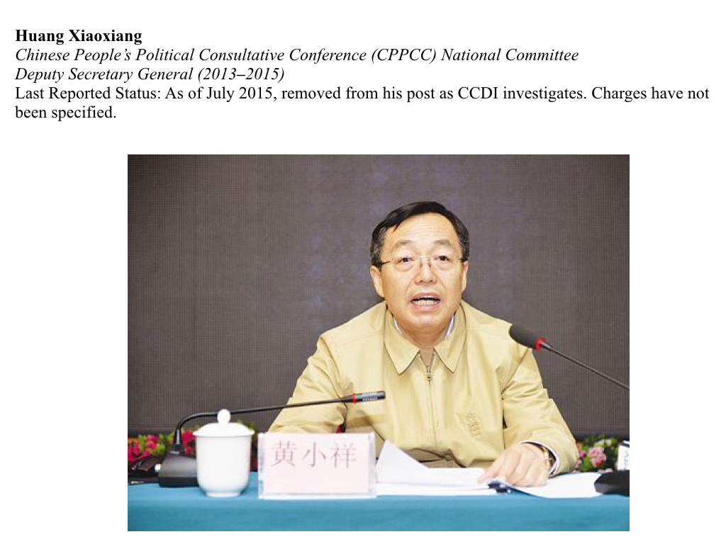 Huang Xiaoxiang was fired on July 17, 2015. While details remain sketchy, state media reports claim that the CCDI may charge him with adultery and moral degeneracy.
