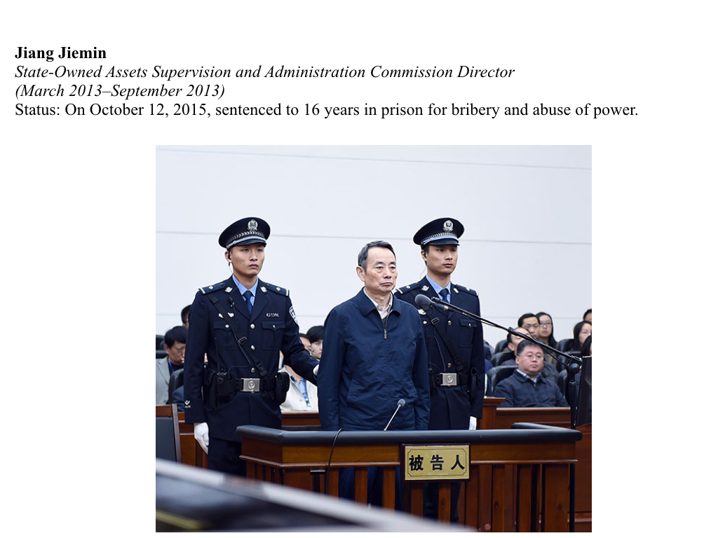 Jiang Jiemin was CEO and chairman of CNPC from 2007–2008, before becoming chairman of subsidiary PetroChina in 2011. Jiang’s April 2015 trial was the first time officials publicly linked Zhou Yongkang to the vast corruption network that would be exposed in subsequent cases.