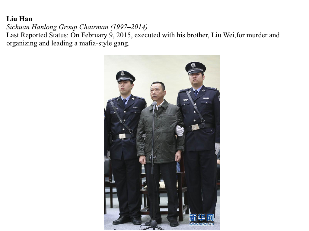 On February 9, 2015, Liu Han, former chairman of mining conglomerate Sichuan Hanlong Group and his brother, Liu Wei, were executed for illegal gang activities. Sichuan Hanlong Group is the largest private enterprise in Sichuan and Han’s personal wealth was estimated in the billions.