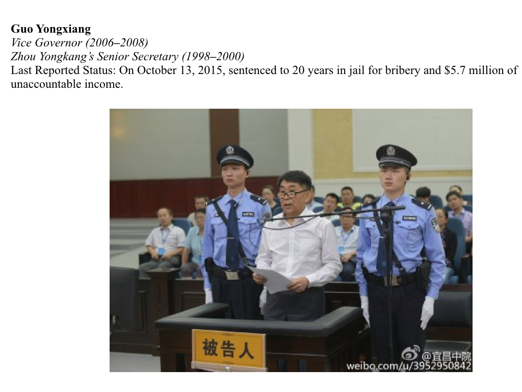 On April 9, 2014, the Supreme People’s Procuratorate announced that Guo Yongxiang was officially under investigation for taking bribes. On the same day, Guo was expelled from the CCP. On July 22, 2015, he stood trial at Yichang Intermediate People’s Court. A year before his trial, a source close to Guo described him “as the eyes and ears of Zhou Yongkang, and at times his go-between.”