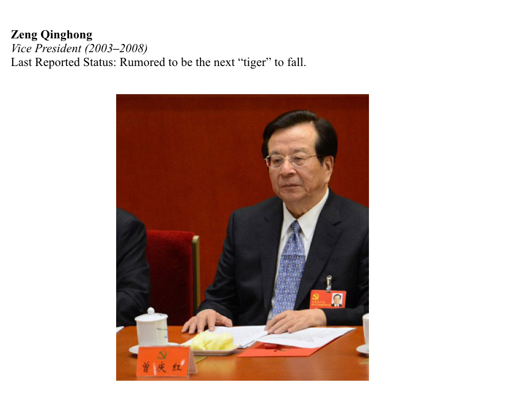 Reuters claimed that Zeng proposed investigating Zhou Yongkang, believing his former protégé was a political risk to the collective leadership. In an interesting turn of events, the Financial Times speculated in February 2015 that Zeng may be the next big “tiger” taken down in the anti-corruption campaign.
