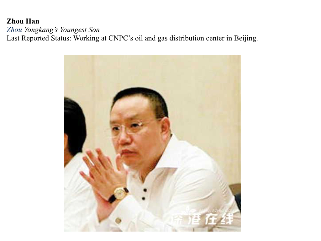 Unlike his older brother, Zhou Han had no interest in leveraging his father’s influence to enrich himself. News reports consistently describe Han as distancing himself from Zhou, particularly after 2000 when his mother died in a fatal car accident. (Rumors suggest that Zhou Yongkang orchestrated the hit-and-run shortly after their divorce was finalized.) Zhou Han works at CNPC’s oil and gas distribution center in Beijing and keeps a low public profile.