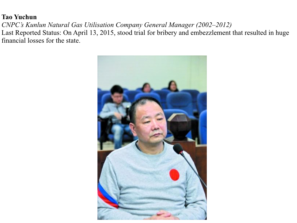 Tao Yuchun was a crucial figure in the investigation against Li Hualin and CNPC. Tao, who held key positions in CNPC and three other affiliated state owned companies, is suspected of being a key handler of the illicit funds connected to Li and CNPC. Tao and Li worked in tandem throughout their careers. While Li served as China Petroleum Hong Kong (Holding) Limited’s vice manager, Tao was a branch manager. After Li became chairman of the Shenzhen Petroleum board, Tao became general manager. During Li’s tenure as chairman, Tao was his most trusted lieutenant, later replacing him. In April 2015, Tao was tried for charges including corruption, abuse of power, and accepting bribes. In total, he is accused of stealing 300 million yuan ($48.24 million).