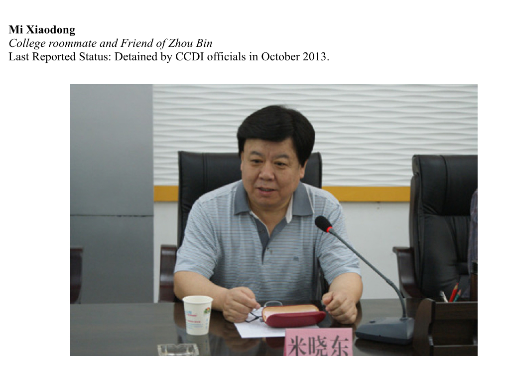 In October 2013, after being identified as the “white glove” or legal front for Zhou Bin, Mi was detained by disciplinary officials. As of publication, Mi Xiaodong’s investigation is ongoing.